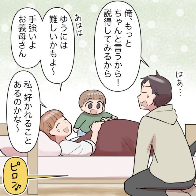 「はあ・・オレ、もっとちゃんと言うから!説得してみるから」と言うゆうさんに、「あはは!ゆうには難しいかもよ~。手強いよお義母さん」そう言った後で、「私、好かれることあるのかな~」マキさんがそう呟くと同時に「ピロン」メッセージが届いた音がしました。