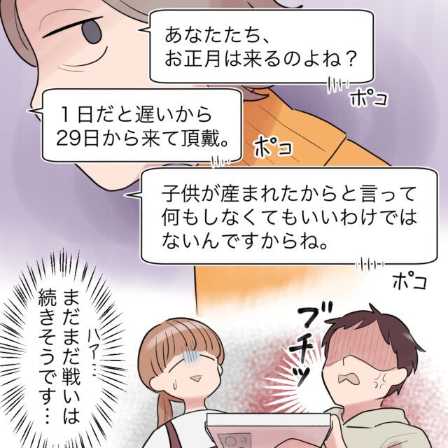そのメッセージには、「あなたたち、お正月は来るのよね?1日だと遅いから、29日から来て頂戴。子どもが生まれたからと言って、何もしなくていいわけではないんですからね」義母が立て続けに送るメッセージを読みながら、「まだまだ戦いは続きそう・・」とマキさんは思うのでした。