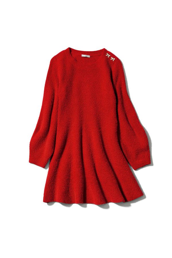 ふわふわの赤ニットでシーズンムードを。 インパクトのあるヴィヴィッドな赤も素材感とたぽっとしたシルエットで女性らしく柔らかい雰囲気に。