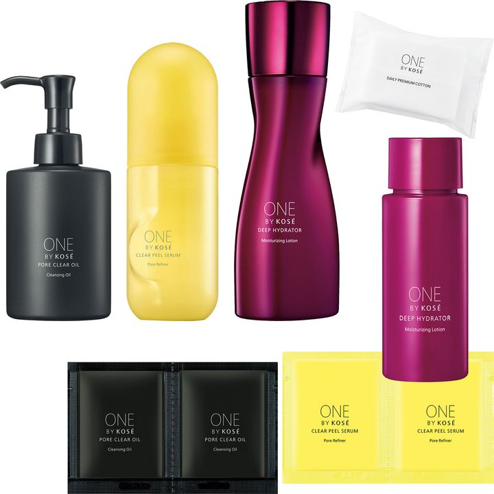 超たっぷりボトルで効果実感もばっちり!ONE BY KOSÉ ポアクリア オイル 3ml×2包、クリアピール セラム 2ml×2包(デイリープレミアム コットン付き)、ディープ ハイドレーター ボトル 30ml