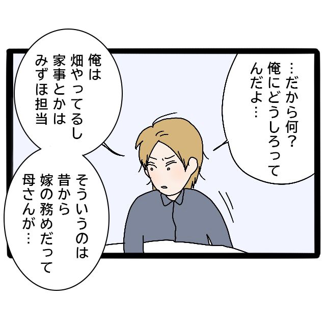 すると、「・・だから何?俺にどうしろってんだよ・・。俺は畑やってるし、家事とかはみずほ担当。そういうのは昔から『嫁の務め』だって母さんが・・」憲一さんは平然とそう言いました。