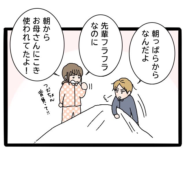 「何のんきに寝てるの!?」そう言って憲一さんを叩き起こしたカオリさん、すると「朝っぱらからなんだよ」と不機嫌そうな憲一さんの声。「先輩フラフラなのに、つむちゃん背負って朝からお母さんにこき使われてたよ!」と訴えかけました。