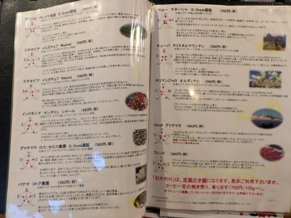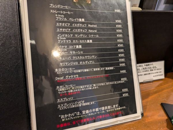 基本のコーヒーは、「ブレンドコーヒー」(480円)を始め、9種類の「ストレートコーヒー」と「エスプレッソ」などがあります。「本日のコーヒー」(480円)は、日替わりでストレートコーヒーがお値打ち価格で楽しむことができ、この日は「Q Grade ペルー ヤネーシャ」(通常価格 560円)でした。