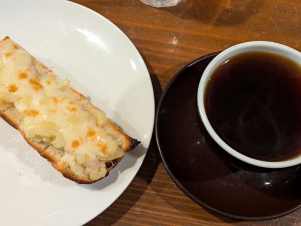 こんがり焼けた「ポテトサラダトーストHalf with チーズ」と共に、提供されたコーヒー。