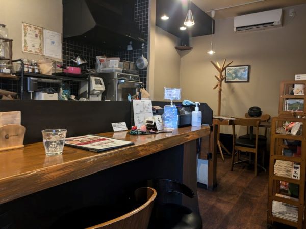 店名の「ALA」(アラ)は、ラテン語で「翼」という意味。「街角で翼を休める場所、コーヒーとくつろぎの案内所にしたい」との想いから、12年前にオープンしたお店です。テーブルや床はダークな色味で、とっても落ち着く雰囲気です。手前にはカウンター席5席と、2人掛けのテーブル席が1つ、一段上がった奥には、2席のカウンター席と2つの2人用テーブル席があります。