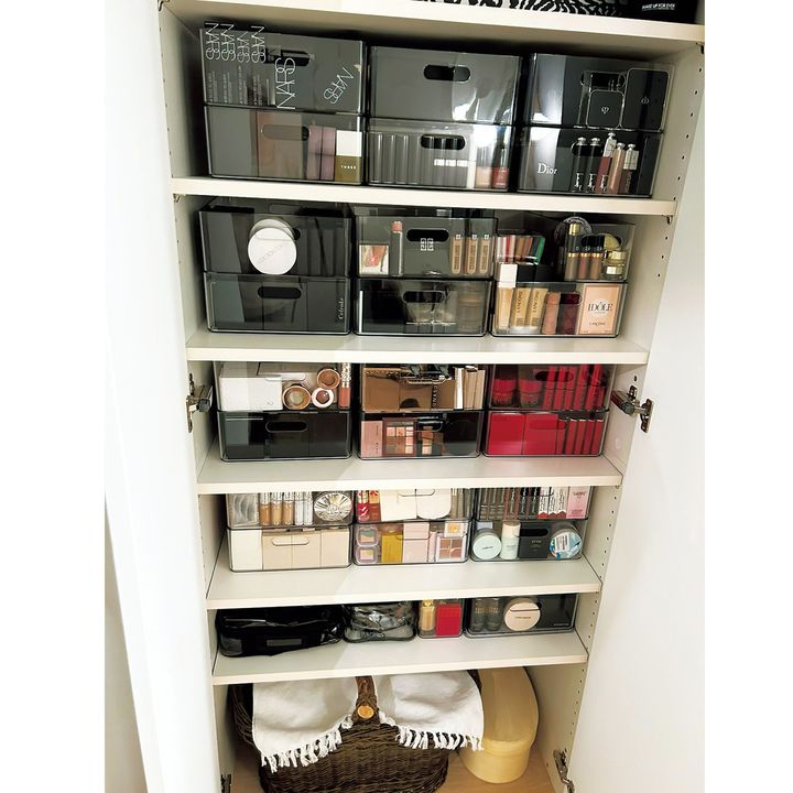 ブランドごとに分け、ニトリの透明収納ケースに。コスメがはみ出ず2段重ねにできる深さ12cmのものがおすすめ。