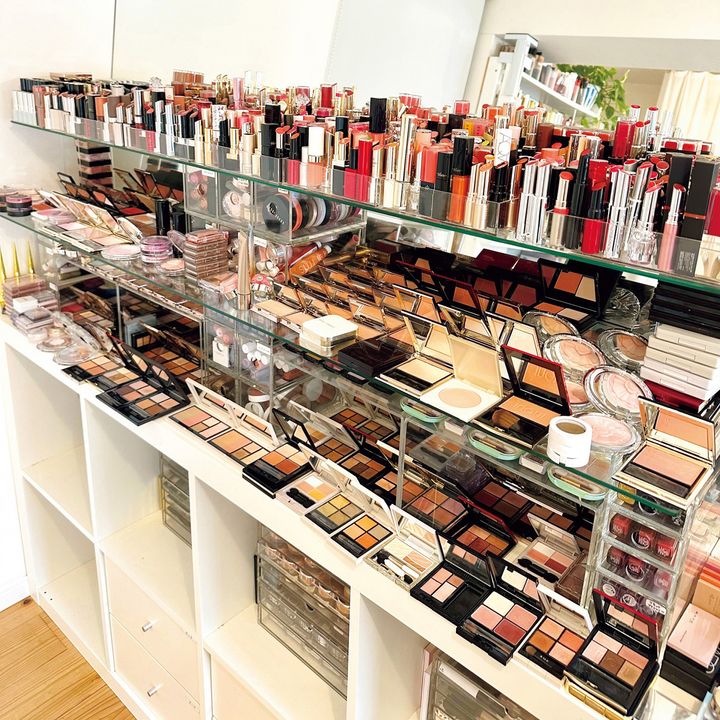 棚には1軍コスメ、引出しにはストックを。ブランドやカラーが一目で分かるよう配置してあるので仕事もスムーズ。新製品が出ると速やかに入れ替えいつも準備万端!