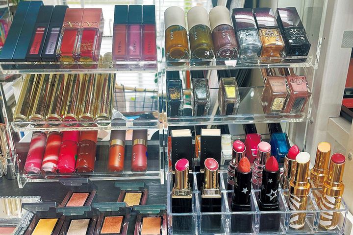 上半期・下半期、デパコス、韓コス、さらにブランドごとに陳列。カラーアイテムは蓋を開けておくことで選びやすい。