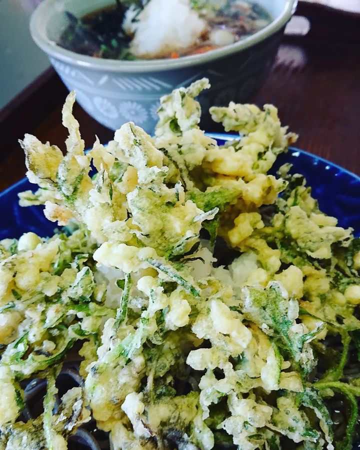 なずなは天ぷらにすると、葉はサクサクとした食感で、根元部分にはなずなの風味と歯ごたえが感じられて美味。