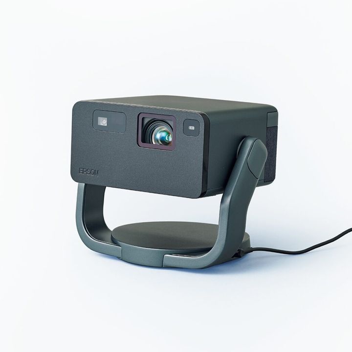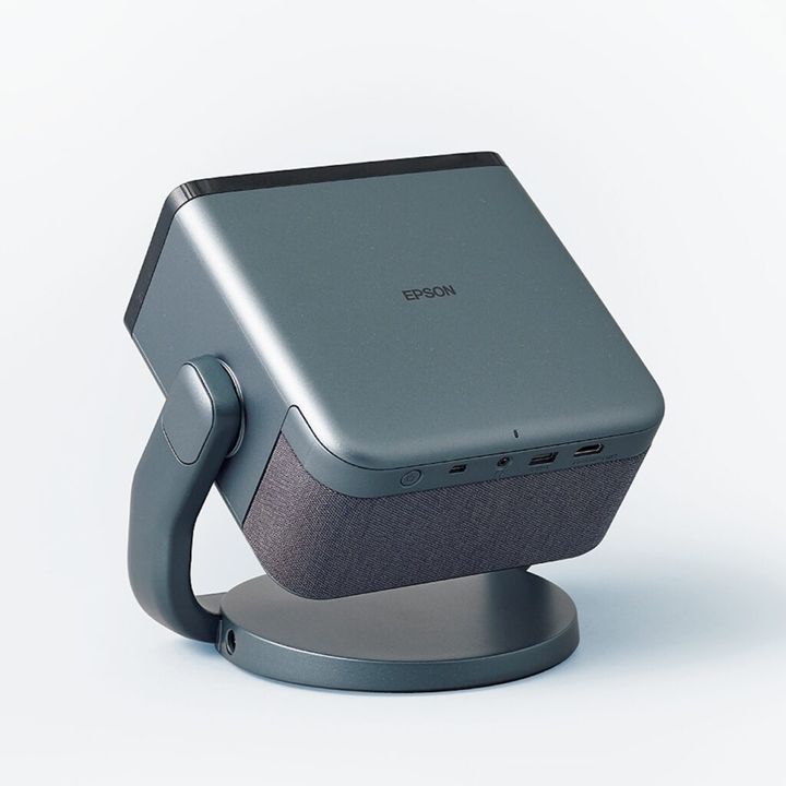 〈エプソン〉から、フット付きで角度調整が可能なホームプロジェクターが誕生。「垂直に150度、水平に360度動かせるのが画期的!棚の上など高い場所に置いても角度をつけられるし、ベッドで寝転びながら天井に投写することもできます。しかも、どこに映してもほんの数秒で歪みやフォーカスをパッと美しく整えてくれて、その スピードにも驚きます。壁に掛け時計などの障害物があれば、自動で避けて、最適なスペースを探してくれる機能も。リモコンはBluetooth接続でさくさく操作できるし、家中に持ち運べるこのサイズ感ながら、明るさ1000ルーメンの画質はとても魅力的です」