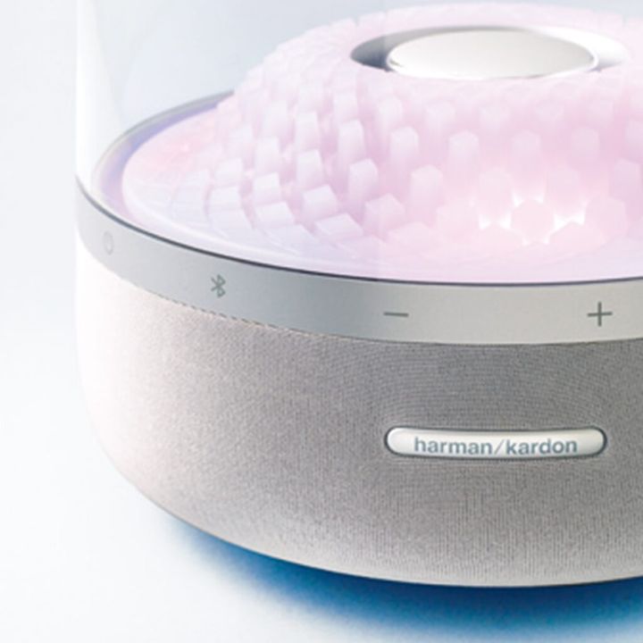 音に合わせてライティングが変化していく仕組み。「5種類の色がリズミカルに移り変わっていく様子は美しく、思わずぼーっと眺めてしまいます。アート作品さながらの見ためでありながら、手が届く価格なのもいい。音量や光の明るさは、本体のボタンひとつで簡単に調整できます」。W23.2×D23.2×H28.4cm 3.6kg ¥39,600 (ハーマンカードン 0570‒550‒465)