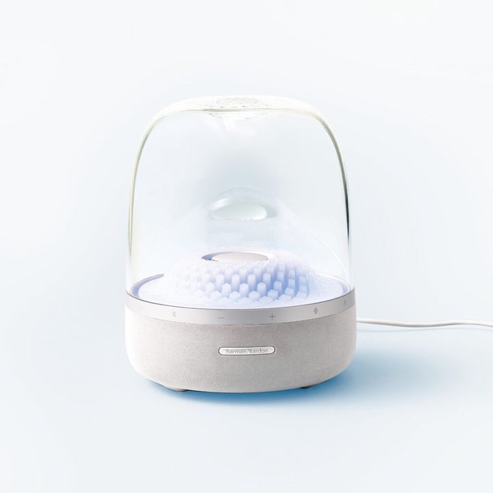 アートピースのような佇まいの〈ハーマンカードン〉のBluetoothスピーカー。「ドームの中にオブジェが閉じ込められているような、神秘的なビジュアル。一見存在感が強いですが、薄くグレーがかったクリアガラスで圧迫感がなく、程よいサイズだからインテリアにも馴染みます。部屋の植物との相性もバッチリでした。スピーカーは、本体をぐるっと囲むように6つ搭載。音が360度ふわっと広がっていくので、リビングの真ん中に置くと、どこにいても音に包み込まれている感覚に。BGMのように小さな音量にしたり、少し離れた場所にいたりしても、クリアですっきりとした音質で心地よく耳に入ってきます」