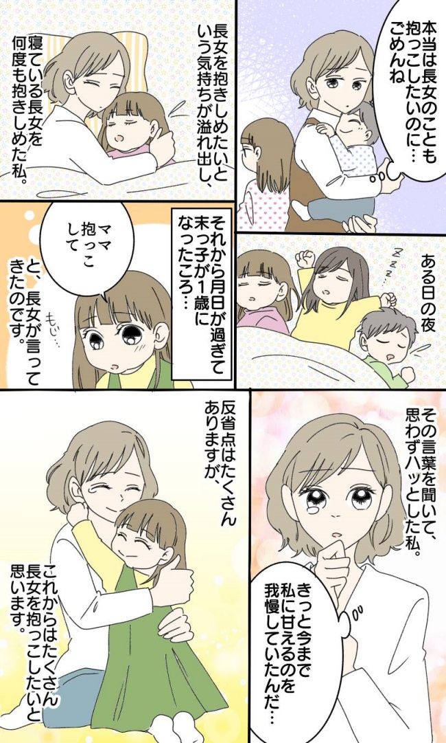 しかし、弟妹に手がかかっていて、当時の私には物理的にも精神的にも、長女を抱っこする余裕がなく、とにかく長女に「ごめんね」の気持ちでいっぱいになりました。私自身も長女のことを弟や妹と同じくらいもっと抱っこしたいという気持ちが溢れ出して、夜、子どもたち全員が寝てから、寝ている長女に何回もハグしていました。