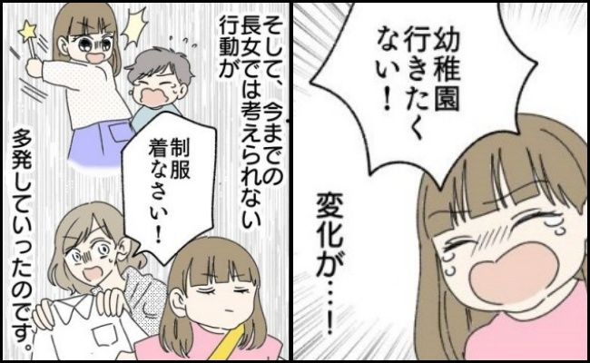 ひどいときには靴を履かないで幼稚園まで歩いてみたり、制服を着ないで幼稚園まで行ってみたりと、今までではありえない行動が多発。家でも長女は赤ちゃん返りのような行動、きょうだいへのイジワル……など、私の長女に対する悩みは尽きませんでした。