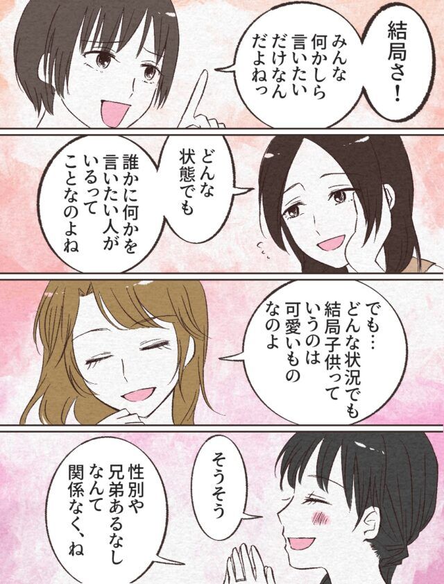 そして姉妹のママが「結局さ!みんな何かしら言いたいだけなんだよねっ!」と言うと、「どんな状態でも、誰かに何かを言いたい人がいるってことなのよね」「でも・・どんな状況でも、結局子どもっていうのは可愛いものなのよ」「そうそう。性別やきょうだいあるなしなんて関係なく、ね」と他のママ達も口々に言い始めました。