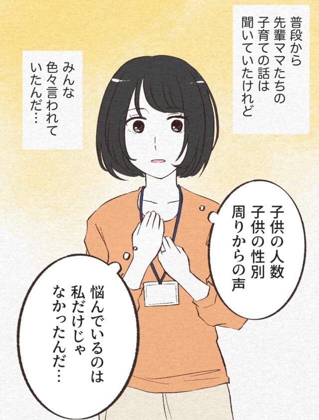 普段から、先輩ママ達の子育ての話を聞いていた奈々さんは、「子どもの人数、子どもの性別、そして周りからの声・・悩んでいるのは私だけじゃなかったんだ・・」とあらためて気づいたのでした。