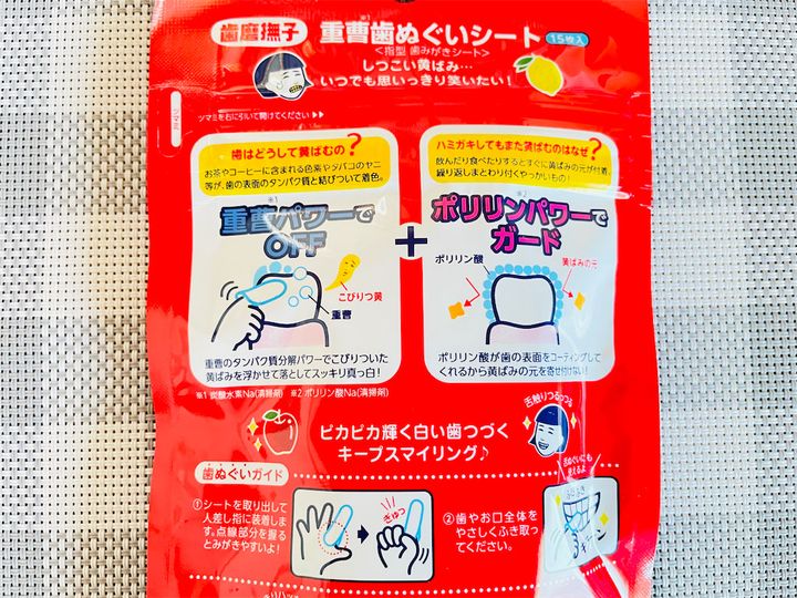 拭くだけで重曹が歯の黄ばみを落とし、ポリリン酸が歯の表面をコーティング、黄ばみのもとをブロックするそうです。
