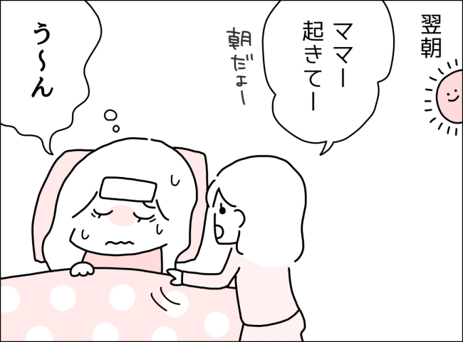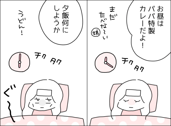 ある日体調不良を覚え測ってみると38.9℃の熱が…。土日は夫に子どもの世話を任せて横になっていることに。普段夫が体調を崩したら妻は看病してあげているのですが、夫は…?