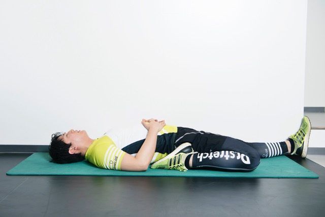 (2)余裕のある方は、さらに前ももの筋肉が伸びるように(1)の姿勢から上半身を寝かせて20秒間キープする
