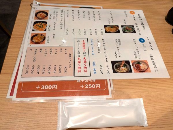 お昼のお品書きのうどんです。温かいうどんか冷たいうどんが選べて、麺の太さも普通か太麺が選べます。うどんの麺は大盛り無料です。そして、丼ぶり・ご飯の大盛も無料です。いいですね~。