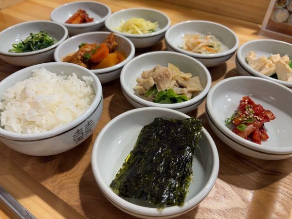 ランチは1300円で、多くの小鉢が所狭しと並んでいます。キムチ、ジャガイモの炒め物、蓮根のサラダ、青菜のおひたし、韓国海苔など9種類ものおかずです。