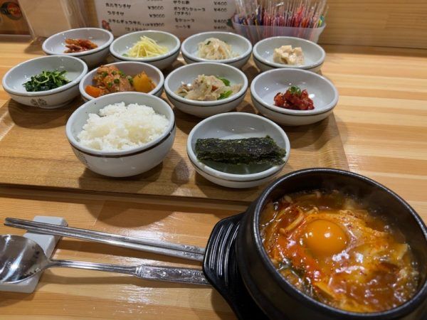 色とりどりの小鉢にテンション上がっていたのですが、なんとその上にスンドゥブが運ばれてきました。グツグツととっても美味しそうです。