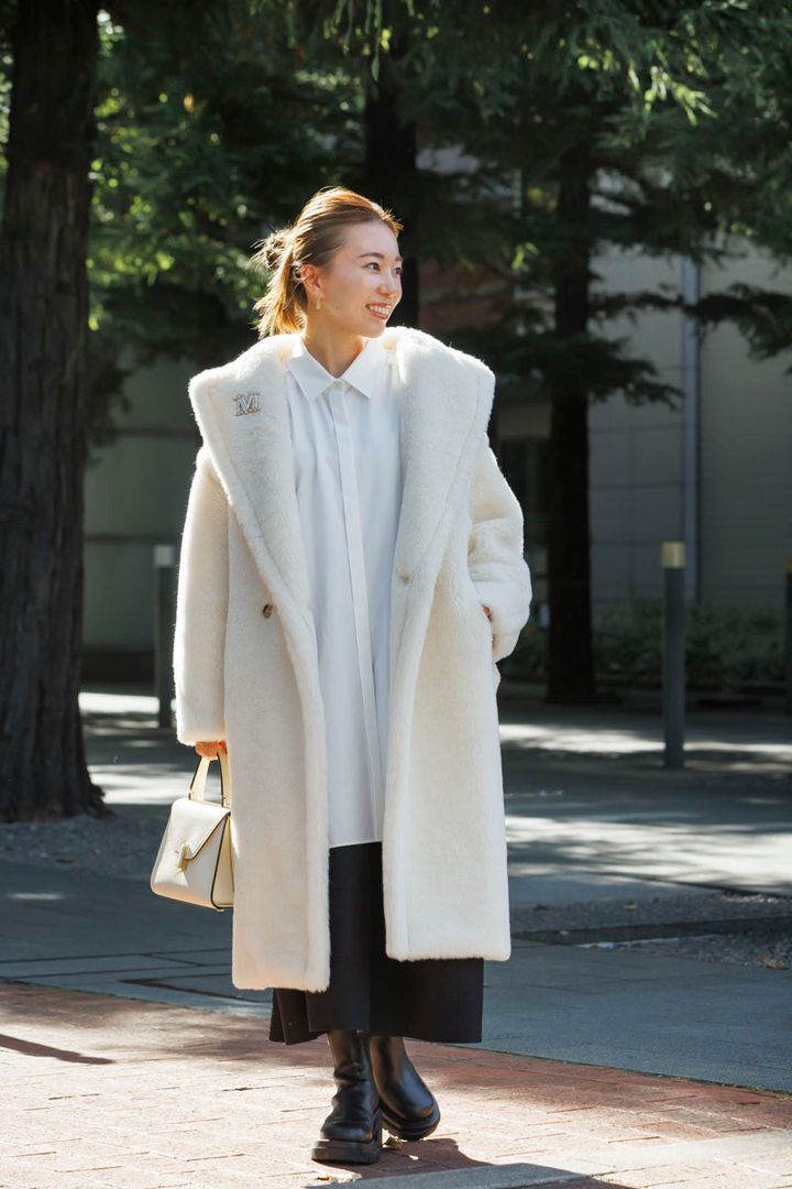 「コスチューム パール付きのハンドルが可愛いミニバッグは、実はスモールレザーグッズ。チェーンで斜めがけにすることが多いですが、ハンドルがあるのでちょこんと持っても可愛いんです。コートにボリュームがあるので、バッグは小さめにしてバランスを取りました」大矢朋子さん・37歳(158㎝ 5歳の女の子ママ)