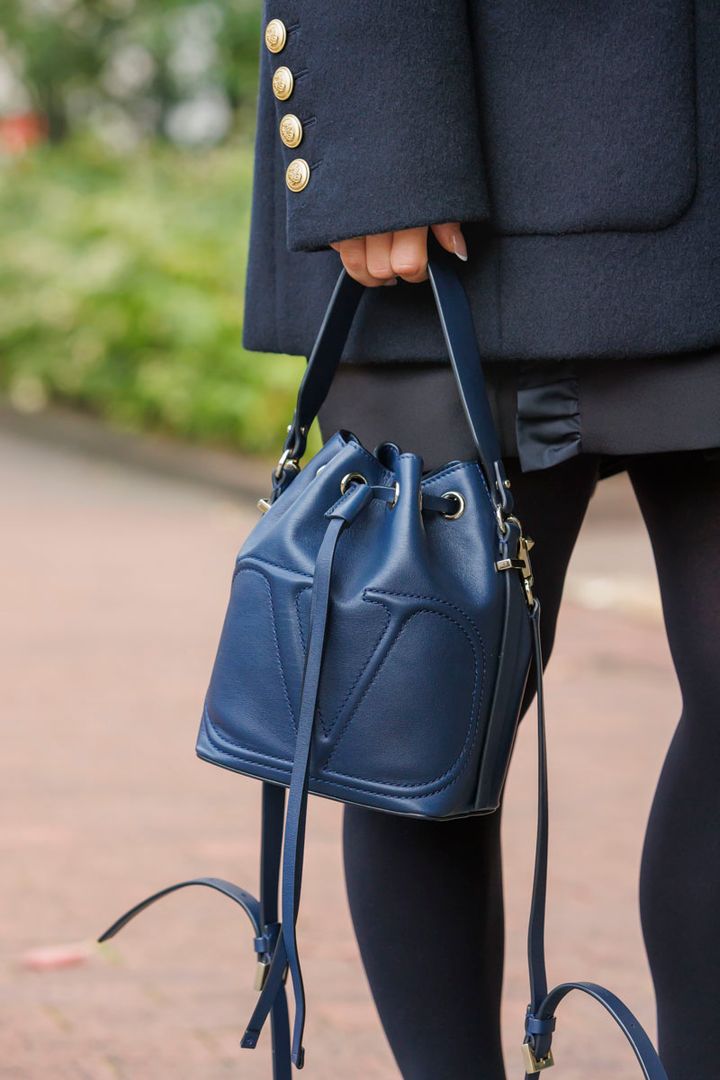 「取り外し可能なショルダーストラップ付きのバッグは子どもと過ごす休日用に購入しましたが、ネイビーなのでオンオフ問わずヘビロテ。巾着型が想像以上に使い勝手がよく、買って大正解でした。打ち合わせにはジャケット合わせで手持ちに、公園ではショルダーで斜めがけにして使っています」堀あかねさん・34歳(154㎝ 3歳の女の子ママ)