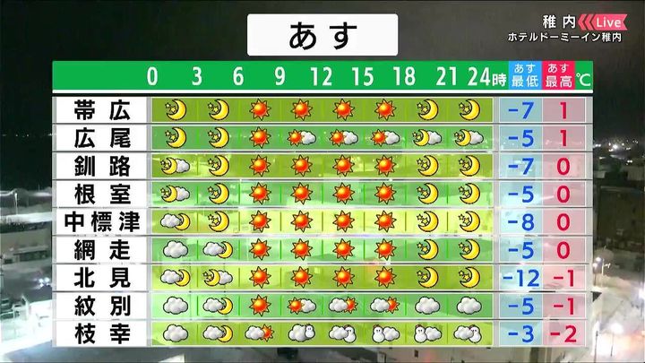 晴れますが、路面凍結に注意して下さい。枝幸では午後を中心に雪が降るでしょう。最低気温は7日朝より大幅に低く、北見は10度ほど低い‐12度の予想です。