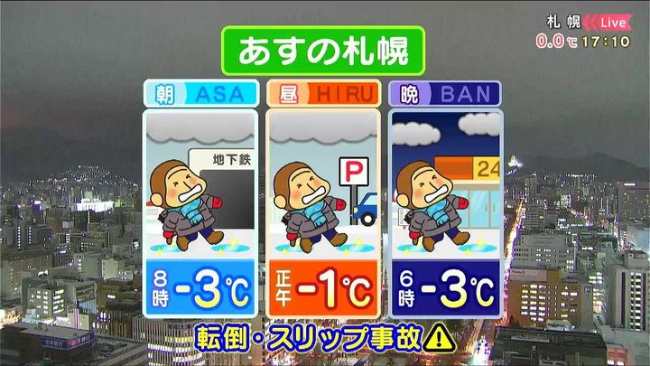 日中でも気温がマイナスの真冬日予想で、路面はツルツルです。地下鉄やお店の出入り口付近、駐車場など歩道が斜めになっているところなど特に危険です。転倒やスリップ事故に注意して下さい。