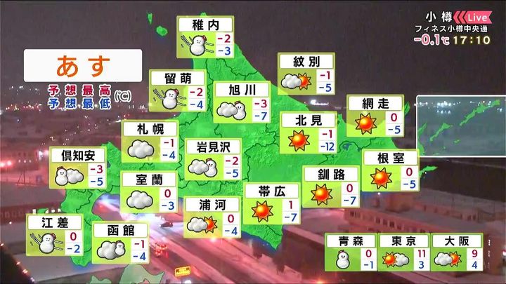 日本海側を中心に雪が降り、ふぶくでしょう。道東方面は晴れる見込みです。寒さが戻り、札幌や岩見沢など最高気温がマイナスの真冬日になりそうです。