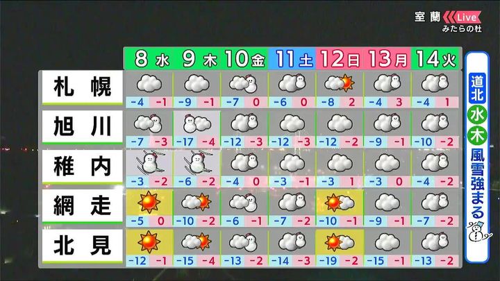 北海道のあす1月8日(水)の天気と、週間予報を、HBCウェザーセンターの児玉晃(こだま・あきら)気象予報士がお伝えします。