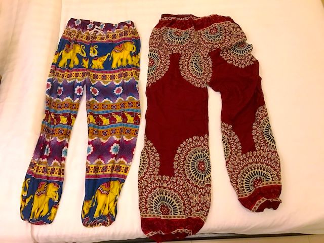 シェムリアップに到着したら、翌日のアンコールワットでの朝日鑑賞に向けて、やっておきたい準備があります。シヴァタ通りという町一番の繁華街に出てカラフルなタイパンツを購入するのがマストなんです! 茶色っぽい遺跡に対してカラフルな色がフォトジェニックに写ること間違いなし。さらに遺跡では泥だらけになるので履きつぶして現地でさよならしてしまえば、荷物も減って一石二鳥。派手なボトムに合わせて、日本からはシンプルな白や明るめのトップスを持っていくときれいです。