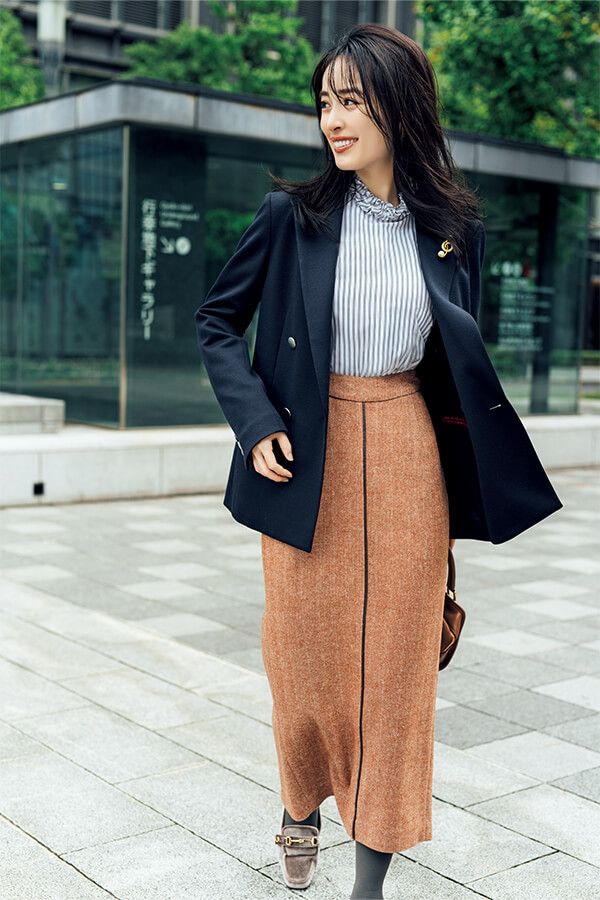 ブラウスの白地に映えるダブルストライプが、トラッドな雰囲気も持ち合わせていて新鮮。フリル襟で顔まわりもパッと華やぐ!