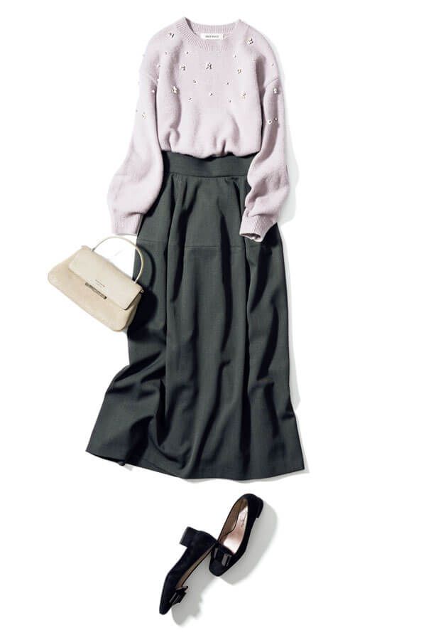ニット¥7,920/MISCH MASCH スカート¥10,989/NATURAL BEAUTY BASIC バッグ¥64,900/ケイト・スペード ニューヨーク(ケイト・スペード カスタマーサービス) 靴¥24,200/銀座かねまつ(銀座かねまつ6丁目本店)