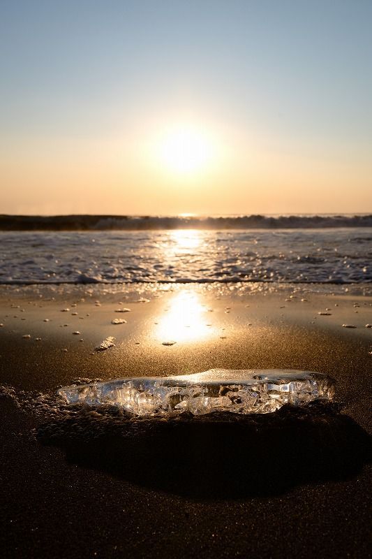 波の強さによって撮り方も変わるでしょうし、いい形の氷を見つけても砂まみれだったり。