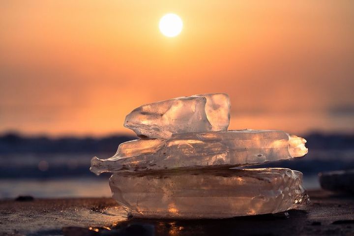 真っ白な氷が太陽の光によってオレンジ色に変化し、キラキラしている。