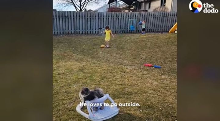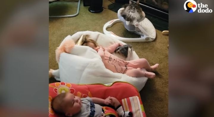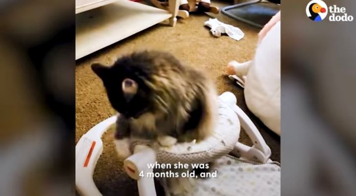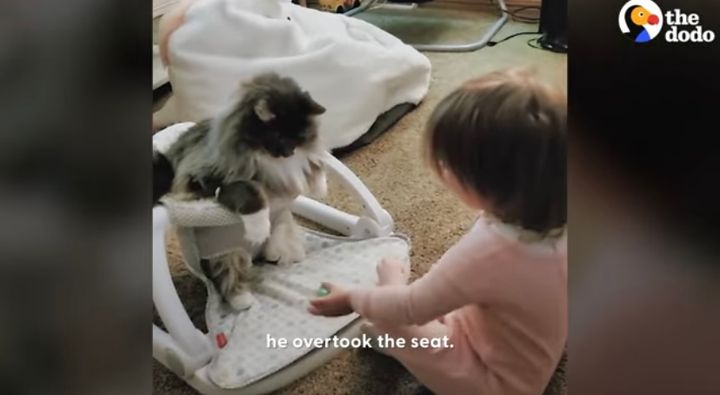 赤ちゃんと遊んでいるのは、お気に入りのベビーチェアにまたがっているネコ。 どうやら、この子は家族にとってもうひとりの赤ちゃんみたいです!