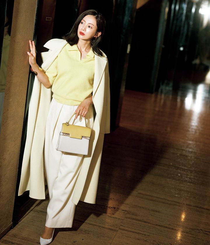 コート¥37,400(ミラ オーウェン/ミラ オーウェン ルミネ新宿2店)ニット¥59,400パンツ¥47,300(ともにキャバン/キャバン 丸の内店)バッグ¥933,900(デルヴォー)パンプス¥108,900(ジャンヴィト ロッシ/ジャンヴィト ロッシ ジャパン)イヤーカフ¥25,300(リューク)バングル¥51,700(ミショー/ハウス オブ ロータス)
