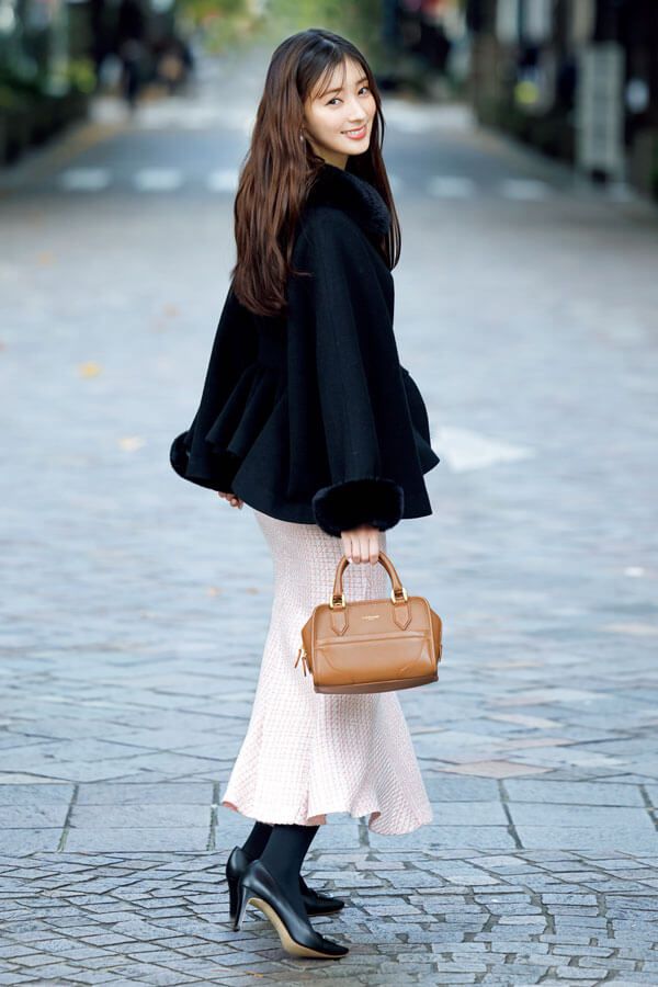 ケープコート¥33,000/MISCH MASCH スカート¥14,300/31 Sons de mode(ヒロタ) イヤリング¥17,600/アビステ バッグ¥198,000/J&M デヴィッドソン(J&M デヴィッドソン カスタマーセンター) タイツ¥1,100/満足(福助) パンプス¥17,600/ダイアナ(ダイアナ 銀座本店)