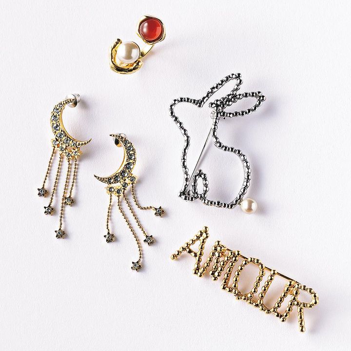 〈上から時計まわりに〉リング〈真鍮、ガラスパール、ガラス〉¥17,600うさぎブローチ〈真鍮、ガラスパール〉¥17,600 AMOURブローチ〈真鍮〉¥17,600ムーン×スターピアス〈真鍮、ガラス〉¥20,900(すべてアデル ビジュー/アデルビジュー ショールーム)構成/伊達敦子 ※情報は2024年10月号掲載時のものです。