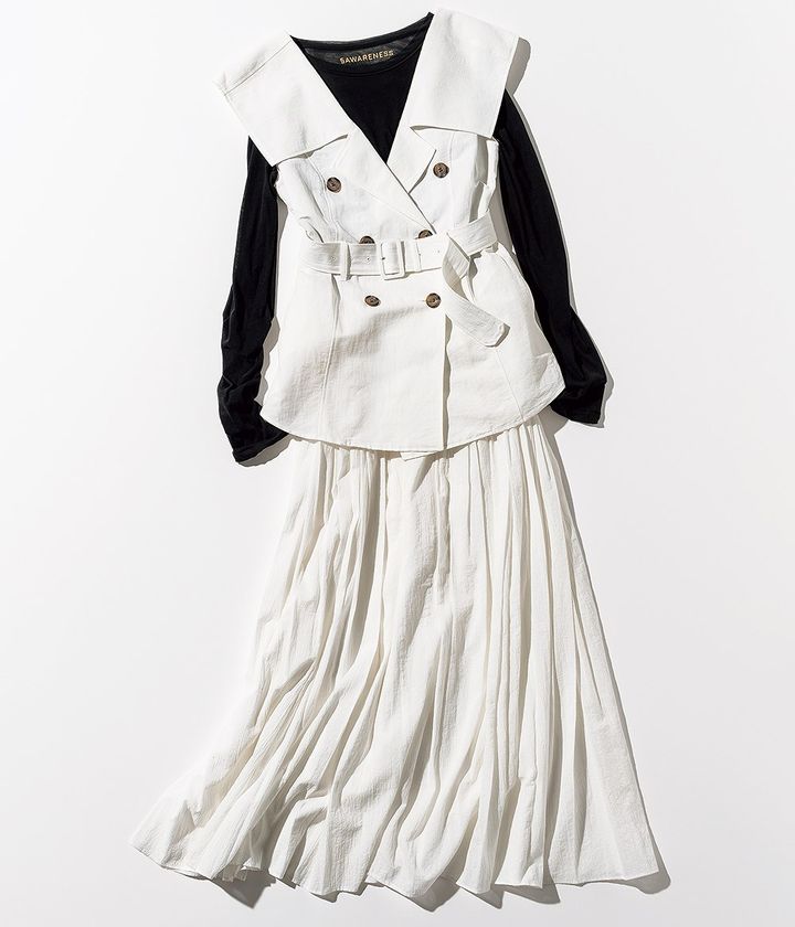 シャツ¥58,300スカート¥59,400(ともにアキラナカ/ハルミ ショールーム)カットソー¥12,100(ファイブ アウェアネス/カレンソロジー二子玉川)撮影/佐藤 彩 ※情報は2024年5月号掲載時のものです。