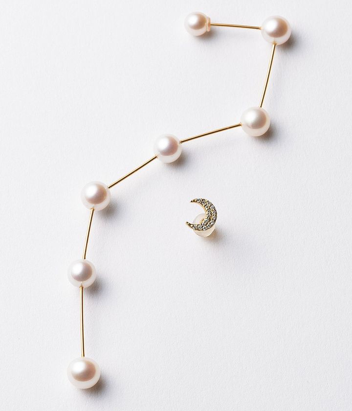 ピアス〈北斗七星〉[K18YG×淡水パール]¥70,400〈三日月〉[K18YG×DIA]¥84,700(ともにビジュー ド エム)撮影/佐藤 彩 ※情報は2024年1月号掲載時のものです。