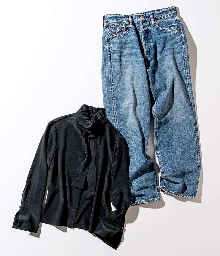 ブラウス¥19,000(バナナ・リパブリック) デニムパンツ¥39,600(ニードバイヘリテージ/ゲストリスト)撮影/佐藤 彩 ※情報は2024年2月号掲載時のものです。