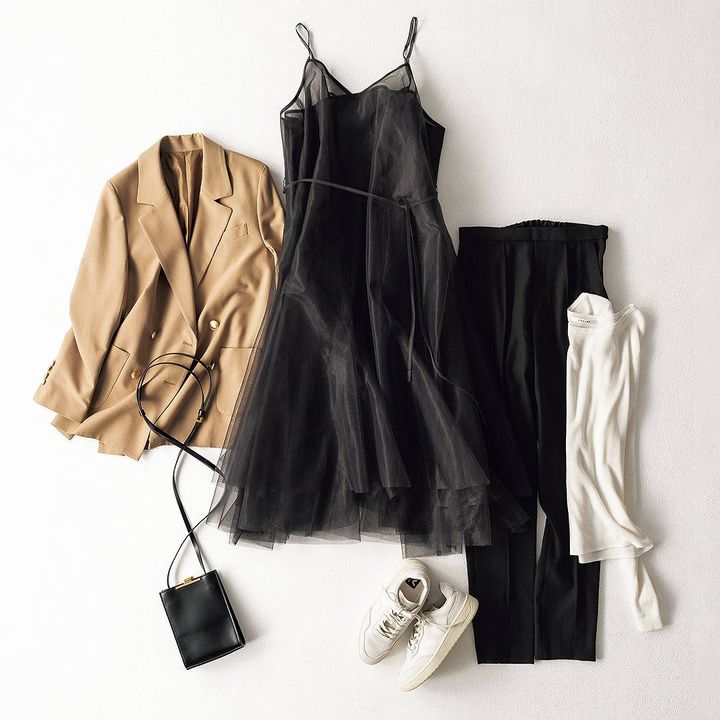 ワンピース¥13,200(M_/MOUSSY/バロックジャパンリミテッド) ジャケット¥23,100 ニット¥13,200 パンツ¥18,700(すべてカデュネ/カデュネ プレスルーム) バッグ¥91,300(ザンケッティ/八木通商) スニーカー¥29,700(ヴェジャ/シードコーポレーション)撮影/佐藤 彩 ※情報は2024年2号掲載時のものです。
