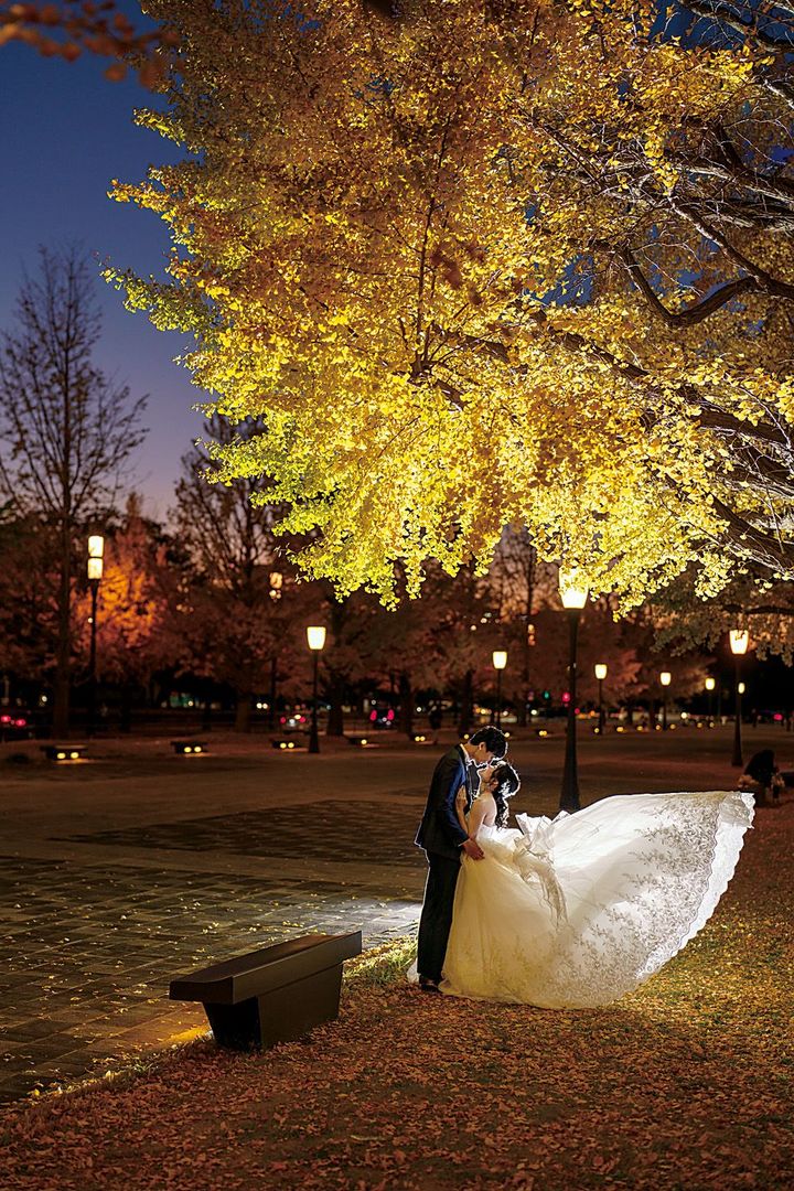 紅葉で美しく色づくイチョウの木の下で。黄色い落ち葉のじゅうたんに、夕暮れのマジックアワーが重なって幻想的な風景に。