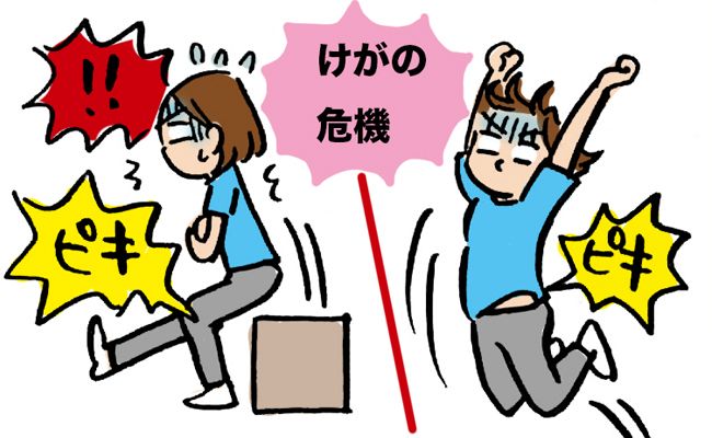 立ち上がりテストも、立ち幅跳びのけがの危機も、どちらも日ごろの運動不足が原因です。現在の自分の体力を知るための測定で、けがをしていては仕方がありません。