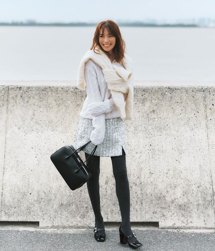 ニット¥94,600(ヴィンス/コロネット)肩に巻いたカーディガン¥49,500(ハウス オブ ロータス)スカート¥19,800(FRAY I.D/FRAY I.D ルミネ新宿2店)バッグ¥86,900(メゾン カナウ/ヤマニ)シューズ¥158,400(セルジオ ロッシ/セルジオ ロッシ カスタマーサービス)タイツ/スタイリスト私物