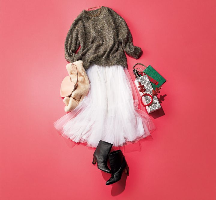 チュールスカート¥24,970(ネイヴ)スパンコールスカート¥24,970(ネイヴ)ニット¥9,990(PLST)カットソー¥9,900(ルージュ・ヴィフ アンナ/アバハウスインターナショナル オンラインストア)バッグ¥6,930(カシュカシュ/アンビリオン)ブーツ¥22,000(シー ユナイテッドアローズ/ユナイテッドアローズ カスタマーサービスデスク)
