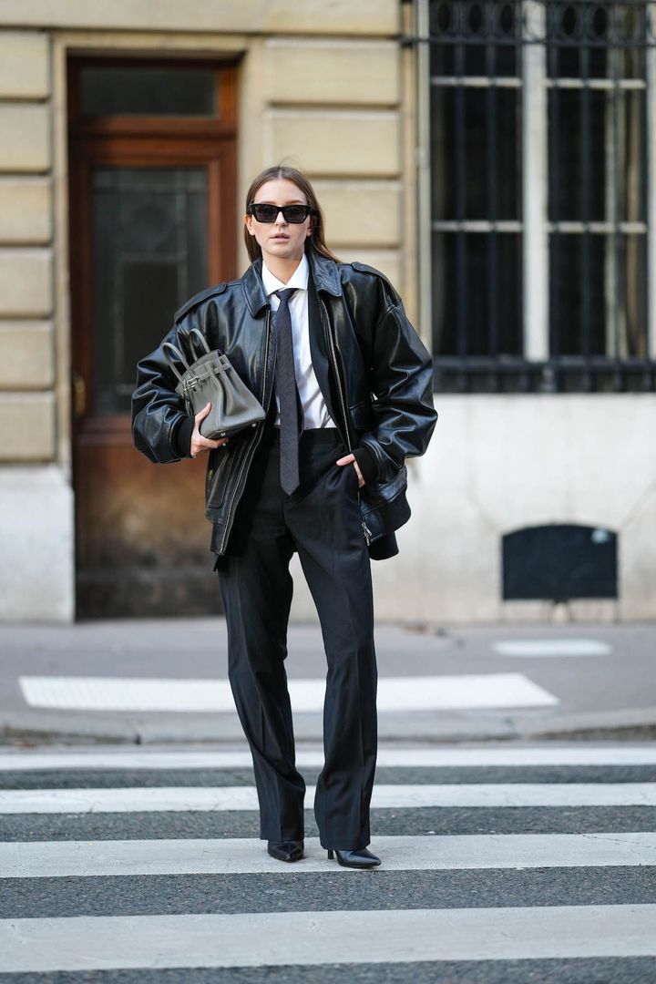 ワイドなシルエットのレザーフライトジャケット、ブラックのスリムなスーツにシャツタイ、そしてサングラスを組み合わせたルックは、前述のショーを彷彿とさせる。難易度が高いスーツルックは、シックなモノトーンで統一し、さらにカジュアルなナロータイをチョイスすることで、グッと取り入れやすくなるはず。さらに、エレガントなエルメスHERMÈS)のバーキンを加え、より洗練された着こなしを叶えている。
